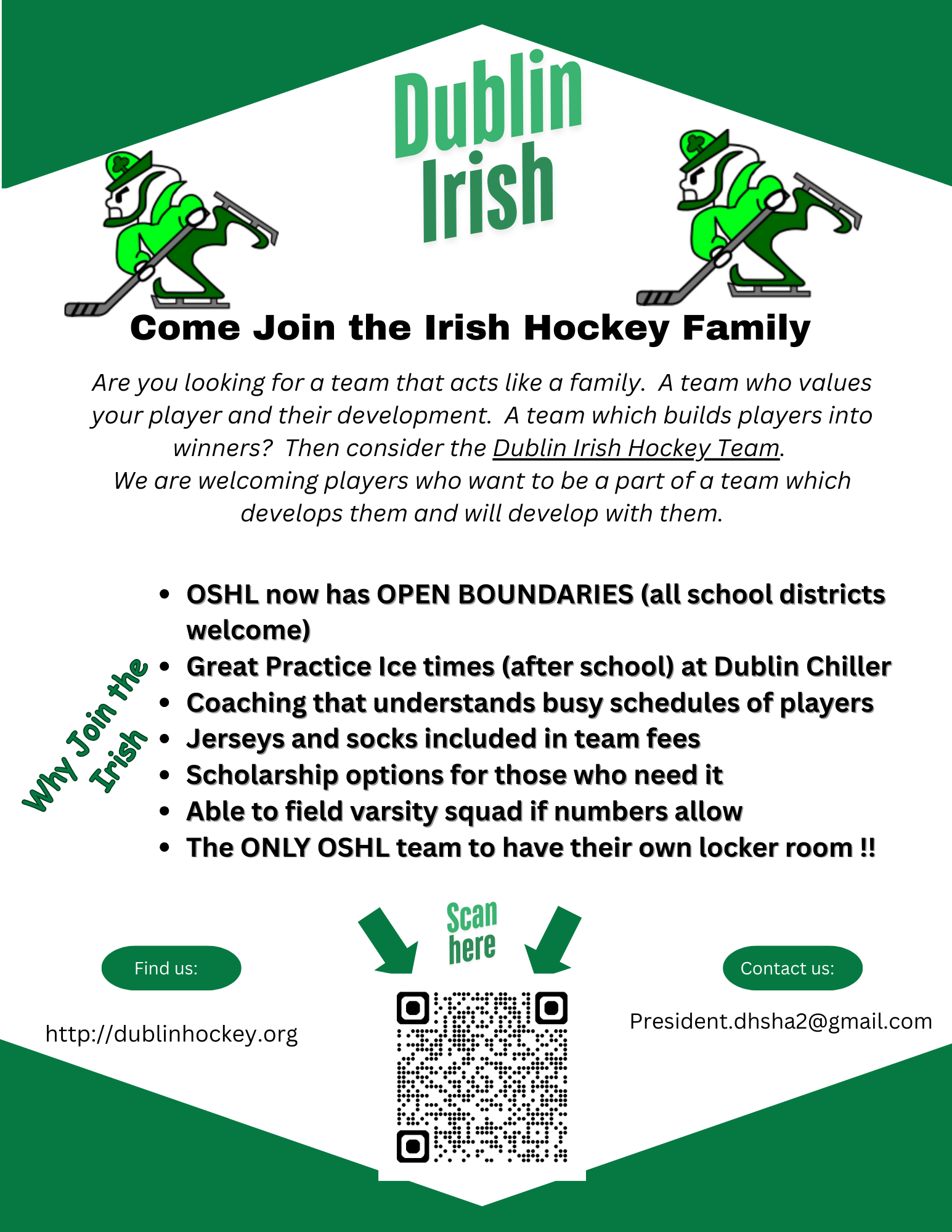 The Dublin High School Hockey Association understands that entering high school hockey is new to many and can be confusing. This web page is designed to help new players and their families entering into Scioto High School and any location covered by OSHL club hockey navigate promoting from youth hockey into high school hockey.
